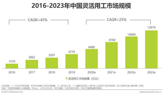 艾瑞《2021年中國(guó)靈活就業(yè)市場(chǎng)發(fā)展研究報(bào)告》:如果未來復(fù)合年增長(zhǎng)率保持在25%,2022年靈活就業(yè)市場(chǎng)規(guī)模將突破1萬億元。